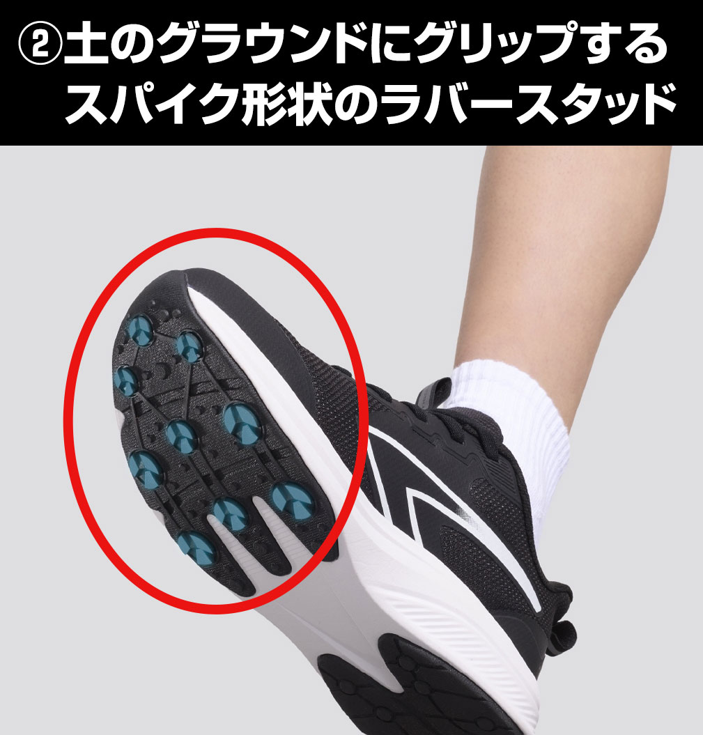 ◇走りを支える「高機能ソール」。土の上でグリップするラバースタッドと、反発力のあるミッドソールが走りをサポート。