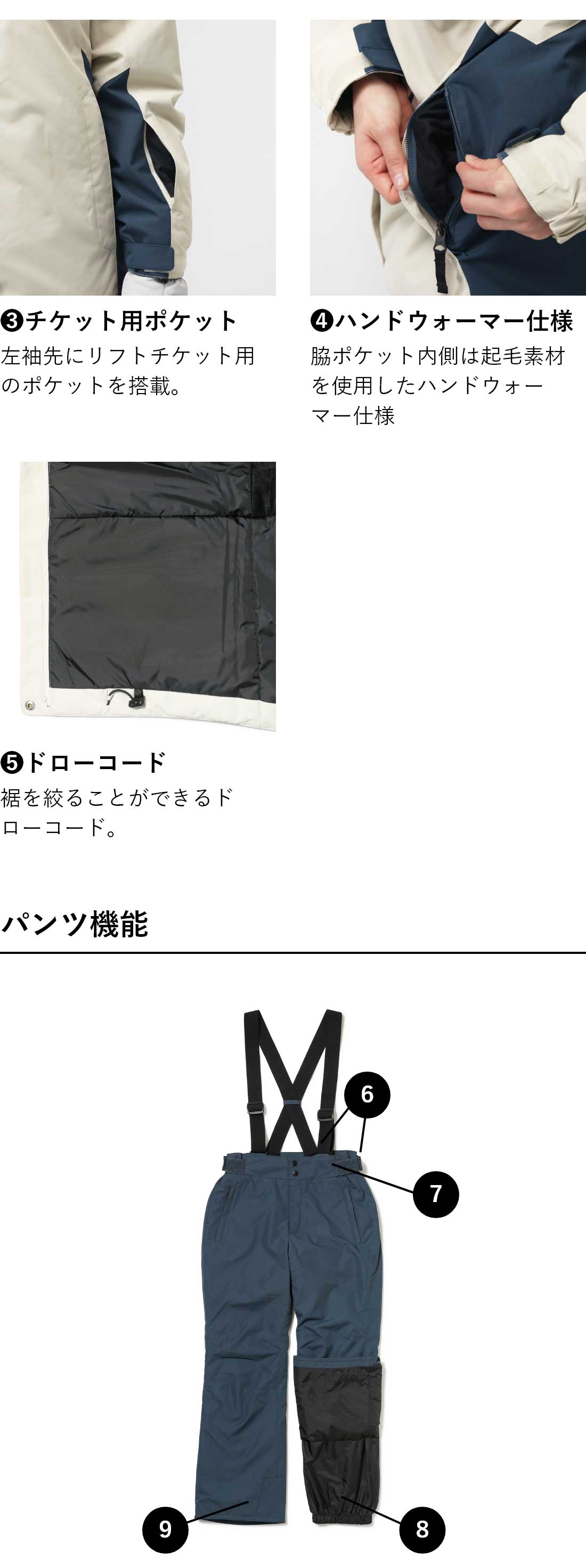 ◇アクセントカラーがシンプルになり過ぎず、スタイリッシュな印象になります。パンツには取り外し可能なサスペンダーやウエスト脇のサイズ調整アジャスター付き。