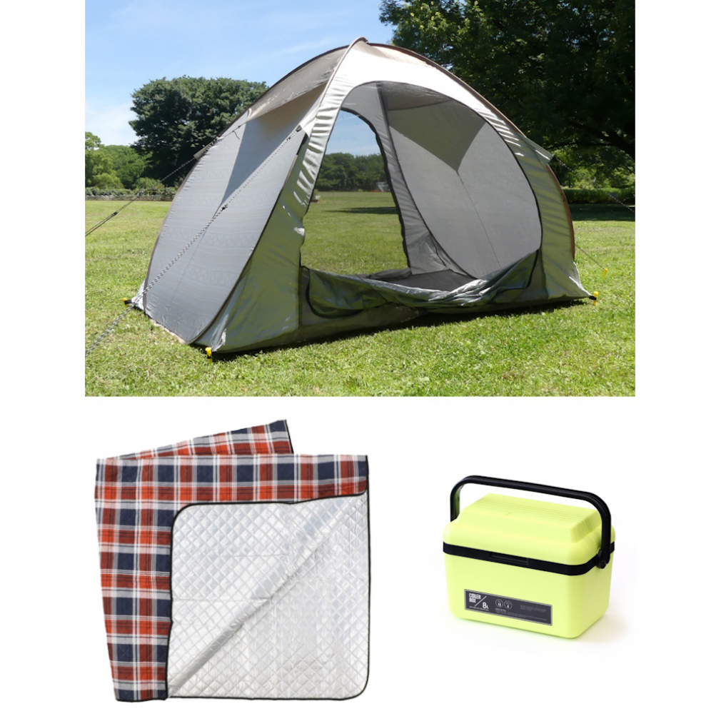◇広げるだけの簡単設営。アウトドアレジャーに最適な日よけテント。ワイドフロアで広々使える。