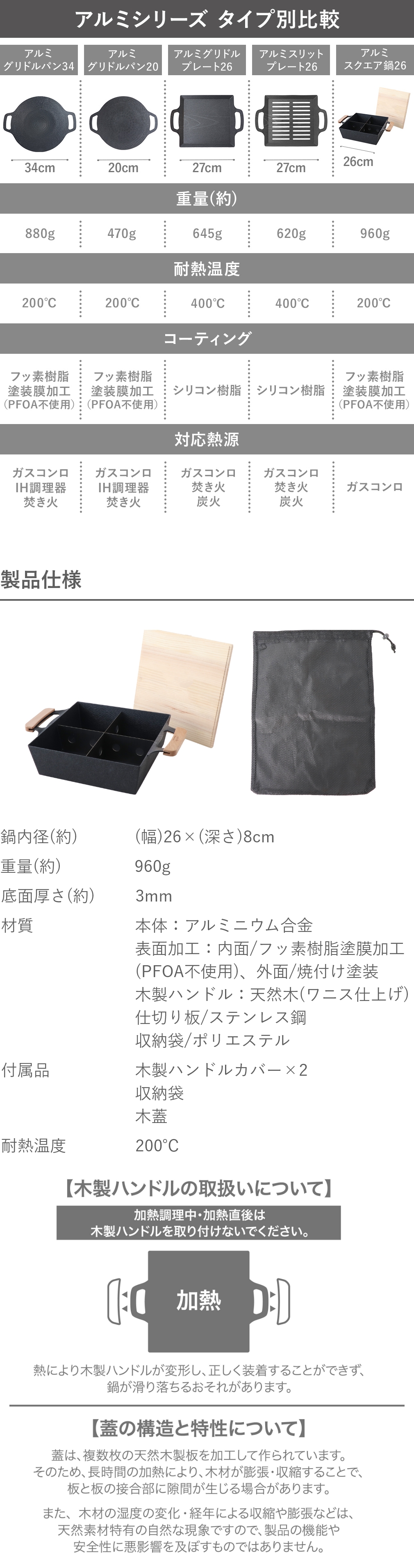 ■素材:鍋本体/アルミニウム合金、ハンドル/天然木、蓋/天然木、仕切り板/ステンレス