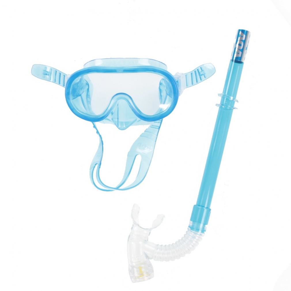 ◇プラスチックレンズを採用し軽量化したフレームレスのスタンダードなマスクとスノーケルの子供用セット。