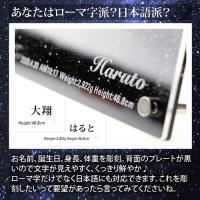 | 赤ちゃん誕生記念にご家族やおじいちゃんおばあちゃんへの贈り物にも最適! 出産祝い用のギフトとしても承ります フォトフレームの写真は自由に差し替えが可能 この商品は、アクリル製フォトフレームに高性能レーザー加工機で名前などを彫刻します。 アクリル製なので割れづらく安全で、半永久的に残るメモリアル商品です。 背景が黒いので写真がよりはっきり見えます | |