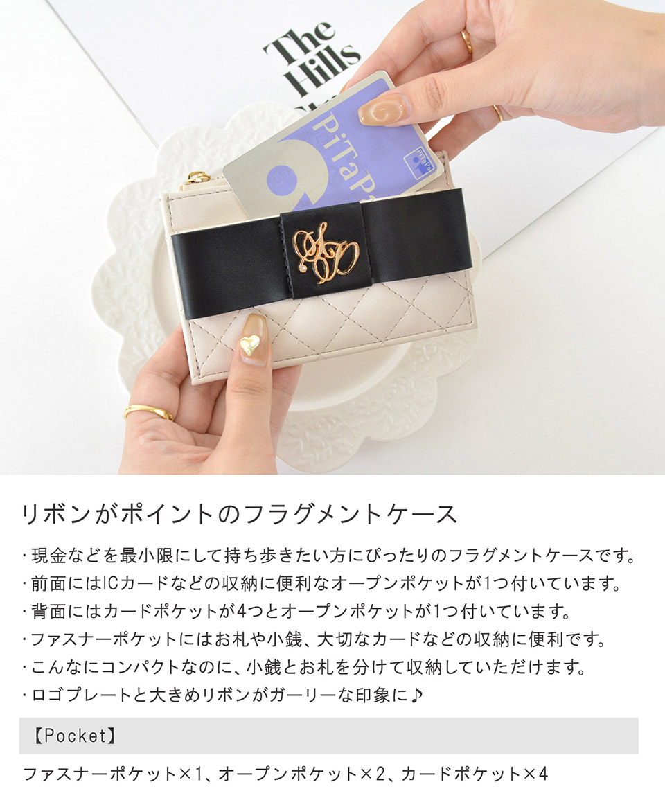 | ・現金やカードを最小限にして持ち歩きたい方にぴったりのフラグメントケースです。 ・前面にはICカードやレシートなどの収納に便利なオープンポケットが1つ付いています。 ・背面にはカードポケットが4つとオープンポケットが1つ付いています。 ・ファスナーポケットにはお札や小銭、大切なカードなどの収納に便利です。 ・こんなにコンパクトなのに、小銭とお札を分けて収納していただけます。 ・ロゴプレートと大きめリボンがガーリーな印象に♪ |