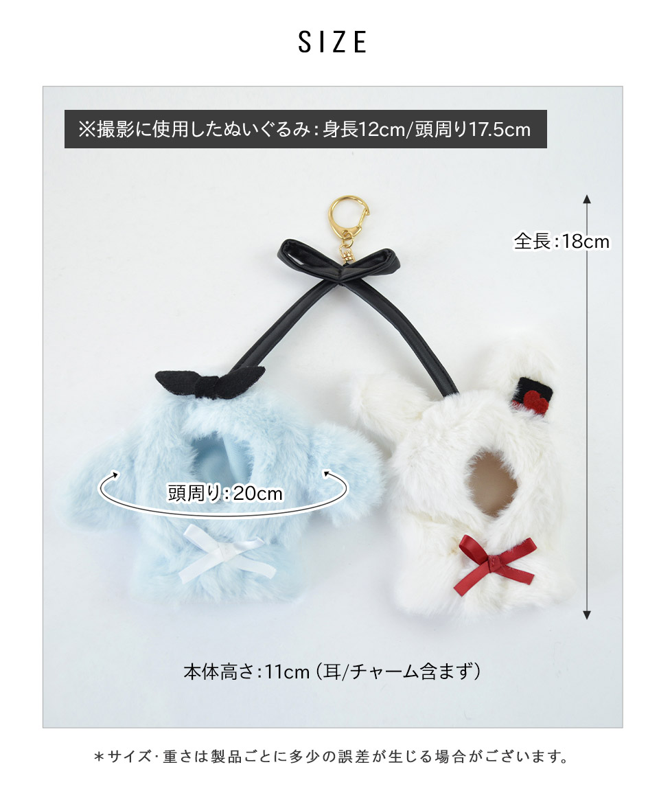 | 全長:18cm 頭周り:20cm 高さ:11cm(耳、チャーム含まず) |