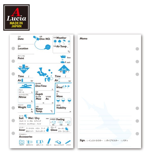 ログブック 6穴タイプ 30枚 30ダイブ゛分 ナイトロックス対応 ダイビングアクセサリー ログブックレフィル ブルー×ブラック dive-1