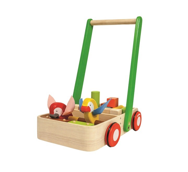 押すと動く2羽の鳥と16個の木製積み木が付いた手押し車です。