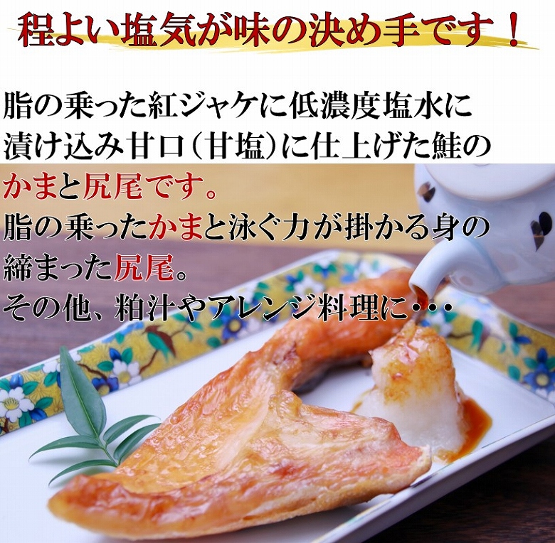 銀鮭(チリ産・養殖)、食塩/酸化防止剤(V.Cチャ抽出物)賞味期限:枠外に記載(保存方法:−18℃以下にて保存) 加熱調理用(加熱してお召し上がりください)1尾から2ヶ所しかない希少部位のカマと尻尾です。脂のりが良いカマと泳ぐのに一番使う身の締まった尻尾焼いてお召し上がりになるのも良し!粕汁等にもアラとしてお召し上がりになるのも良し!その他、アレンジ料理にも活躍! |