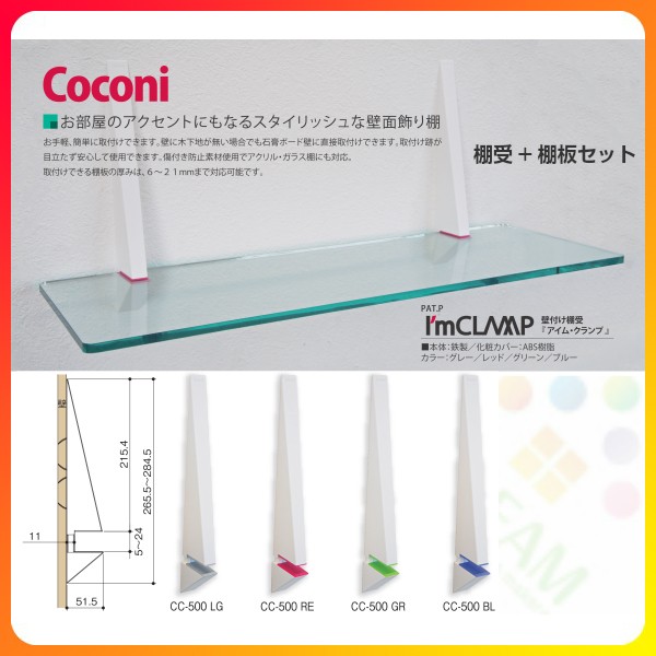壁付け棚受 壁面飾り棚 透明アクリル棚板セット Coconi I'm CLAMP アイム・クランプ CC-500 + CC-550 AG 6020 巾W600mm 耐荷重8kg