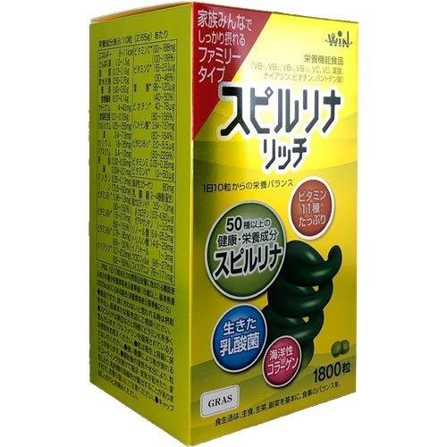 【商品説明】特徴(特長)家族みんなでしっかり摂れるファミリータイプ栄養機能食品(ビタミンB1・B2・B6・B12・C・D、葉酸、ナイアシン、ビオチン、パントテン酸)1日10粒からの栄養バランス海洋性コラーゲン50種以上の健康・栄養成分 スピルリナ生きた乳酸菌現代人の食と美をサポートするワンランク上のベースサプリメントアミノ酸、ビタミン、ミネラルはもちろん50種以上の成分をバランスよく含むスピルリナ(食用藻)は、バランスが悪い現代人の食生活をサポート。スピルリナに、乳酸菌、コラーゲンなどを配合、ビタミン11種たっぷりのスピルリナリッチで嬉しい変化を実感してください。●外食や欠食が多い方に●野菜不足や野菜嫌いの方に●毎日を若々しく、いきいきと過ごしたい方に【用法・用量】用法・用量/使用方法<食べ方>食品ですので特別な定めはありませんが、1日10粒を目安として1〜3回に分けて水またはお湯などでお召しあがりください。【成分・分量】内容成分・成分量<原材料>スピルリナ(アメリカ産100%)、有胞子性乳酸菌、フィッシュコラーゲンペプチド(ゼラチンを含む)、食用油脂末/魚骨焼成カルシウム、V.C、ヒドロキシプロピルメチルセルロース、微粒酸化ケイ素、ピロリン酸第二鉄、クエン酸、香料(乳由来)、ステアリン酸Ca、着色料(二酸化チタン、紅花黄、クチナシ)、ナイアシン、グリセリン、ビオチン、パントテン酸Ca、タルク、糊料(アラビアガム)、V.B2、V.B1、V.B6、V.B12、V.D、光沢剤(カルナウバロウ)、葉酸<栄養成分表示>10粒(2.65g)あたりエネルギー・・・8〜11kcalたんぱく質・・・1.0〜1.5g脂質・・・0.12〜0.19g炭水化物・・・0.50〜0.76g糖質・・・0.43〜0.62g食物繊維・・・0.07〜0.14gナトリウム・・・4〜43mg(食塩相当量 0.01〜0.109g)カルシウム・・・125〜155mg鉄・・・3.4〜7.8mgカリウム・・・18〜35mgマグネシウム・・・3.4〜10mg亜鉛・・・0.02〜0.05mg銅・・・0.004〜0.01mgマンガン・・・0.05〜0.13mgリン・・・13.5〜90mgビタミンB1・・・0.96〜1.8mgビタミンB2・・・1.15〜2.17mgビタミンB6・・・0.78〜1.95mgナイアシン・・・10.7〜20.2mgビタミンC・・・100〜188mgビタミンD・・・1.65〜2.53μg葉酸・・・96〜120μgビオチン・・・40〜78μgパントテン酸・・・3.84〜7.87mgビタミンB12・・・2.0〜5.5μgビタミンE・・・0.05〜0.35mgビタミンK・・・10〜50μgβ-カロテン・・・1570〜4560μgビタミンB12・・・1.3〜3.4μgビタミンE・・・0.05〜0.35mgビタミンK・・・10〜50μg海洋性コラーゲン・・・80mg乳酸菌・・・2〜4億個(配合)総カロテノイド・・・3.5〜10mgβ-カロテン・・・1570〜4560μgゼアキサンチン・・・1.1〜3.5mgリノール酸・・・16.4〜25.2mgγ-リノレン酸・・・原材料・成分スピルリナ(アメリカ産100%)、有胞子性乳酸菌、フィッシュコラーゲンペプチド(ゼラチンを含む)、食用油脂末/魚骨焼成カルシウム、ビタミンC、ヒドロキシプロピルメチルセルロース、微粒酸化ケイ素、ピロリン酸第二鉄、クエン酸、香料(乳由来)、ステアリン酸カルシウム、着色料(二酸化チタン、紅花黄、クチナシ)、ナイアシン、グリセリン、ビオチン、パントテン酸カルシウム、タルク、糊料(アラビアガム)、ビタミンB2、ビタミンB1、ビタミンB6、ビタミンB12、ビタミンD、光沢剤(カルナウバロウ)、葉酸使用方法スピルリナリッチのお召し上がり方 スピルリナリッチは、食品ですので特別な定めはありませんが、1日10粒を目安として1〜3回に分けて水またはお湯などでお召しあがりください。 ご注意: ?食品ですが、体に合わないと思われる時は摂取を中止し、医師または販売店にご相談ください。 ?スピルリナは納豆などと同様にビタミンKを多く含んでいます。ワルファリンを服用されている方は摂取をお控えください。 ?粒は衛生上容器に戻さないでください。 ?強い衝撃により粒が割れることがあります。 ?開封後の湿気や水分により、粒のコーティングが溶けて陥没・変形が起きたり、変色したり、粒内側の深緑色が露出することがありますので、お取り扱いにご注意ください。 ?キャップはしっかりとお締めください。
