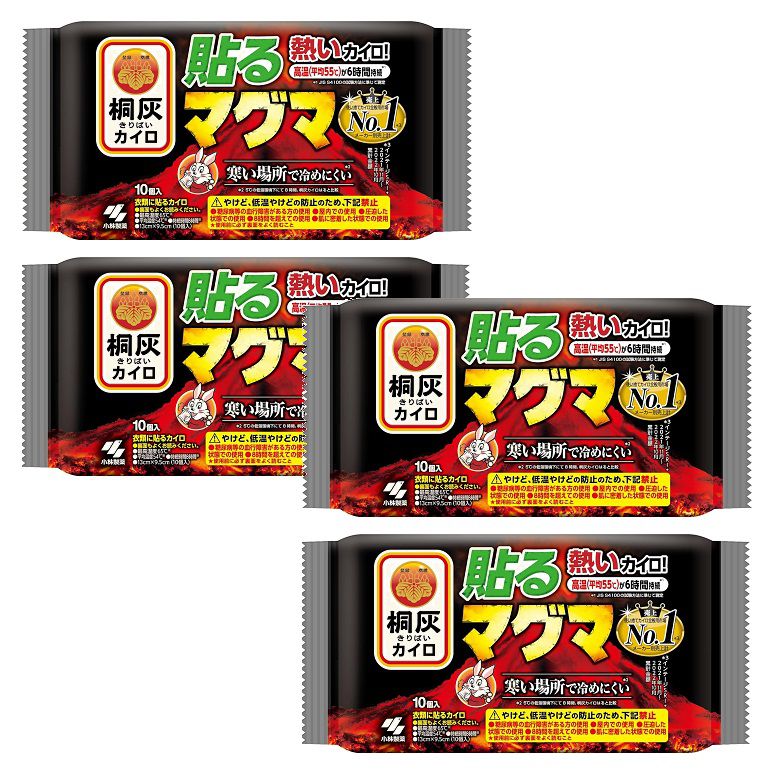 【商品名】 カイロ 桐灰 キリバイ 貼るマグマ 10個入 【×4個セット】 熱いカイロ!高温(平均55℃)が6時間持続*1*1 JIS S4100の試験方法に準じて測定寒い場所で冷めにくい*2*2 5℃の低温環境下にて8時間、桐灰カイロはると比較衣類に貼るカイロ●裏面もよくお読みください。●最高温度65℃※●平均温度54℃※●持続時間8時間※●13cm×9.5cm(10個入)※表示の最高温度・平均温度・持続時間は都条例にもとづく測定値ですので人体にてご使用の場合は若干の差異があります。!やけど、低温やけどの防止のため、下記禁止●糖尿病等の血行障害がある方の使用●屋内での使用●圧迫した状態での使用●8時間を超えての使用●肌に密着した状態での使用★使用前に必ず裏面をよく読むこと売上 使い捨てカイロ全般用市場 No.1*3 メーカー別売上計*3 インテージSRI+ 2021年11月〜2022年10月 累計金額原材料・成分鉄、活性炭、バーミキュライト、水