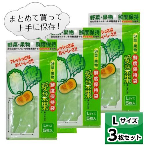| 商品名 | 鮮度保持袋 愛菜果 (L) 5枚入 【お得な3個セット】 野菜 果物 保存 袋 鮮度 簡単 便利 ステイホーム まとめ買い 保湿 白菜 ホウレンソウ カボチャ Lサイズ 節約 |