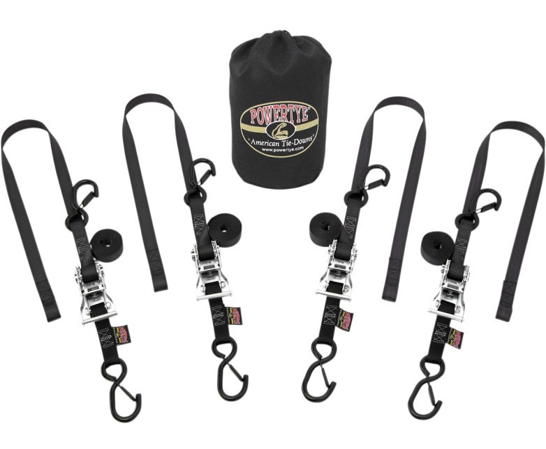 バイクの固定などに便利なラチェット式のタイダウンベルトの4本と収納袋セットです。