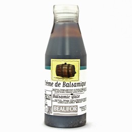 バルサミコ酢に糖分と加工澱粉などを加えてなめらかにしたバルサミコ・ソースです。煮詰めてソースを作る必要がなく、ボトルから直接料理の皿に飾りつけができるので簡単です。