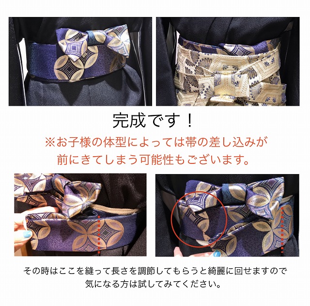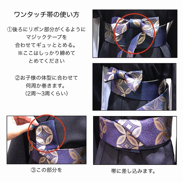 | 特徴 | かっこ良く袴を着たいけれど、ジッとしているのは苦手…。 そんな元気いっぱいの男の子の味方! くるっと巻いてピタッととめるだけのワンタッチ角帯。 七五三の着物などに、男の子の角帯です。 着物に合わせていかがですか |