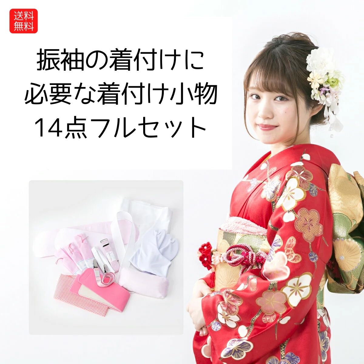 | 着付け小物セット 14点 内容・特徴 | 1 肌着 2 足袋(ストレッチ足袋) 3〜5 腰紐3本組 6 ウエストベルト 8 マジックベルト 9 着付けベルト 10 三重紐 11 前板 12 後板 13 帯枕 14 衿芯 |