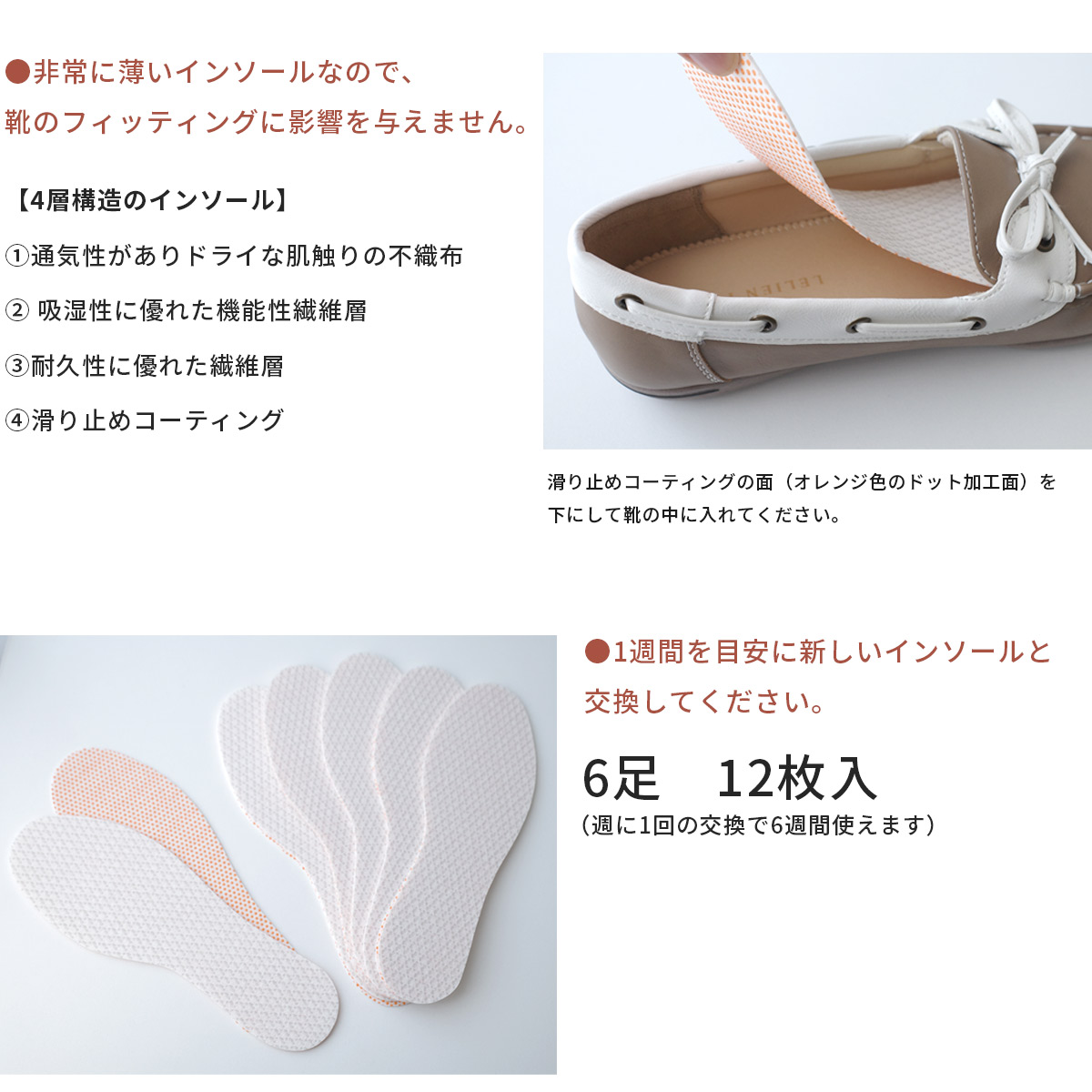 | ■内容量: 6足分 12枚入り ■生産国: ポーランド ■サイズ: 女性用(Sサイズ:22.5〜23.0cm/Mサイズ:23.5〜24.0cm/Lサイズ:24.5〜25.0cm) ■靴にあったサイズをお選びください。 ■滑り止めコーティングの面(オレンジ色のドット加工面)を下にして靴の中に入れてください。 ■1週間を目安に新しいインソールと交換してください。 ■インソールが多量の汗を含むと靴下に色が移る場合があります。時々、陰干しを行ってください。 ■使用状況によっては、インソールが完全に圧着して外れにくくなる場合があり、更にはがすと跡が残る場合もありますのでご注意ください。 ■洗濯はできません。 ■足に痛みを感じたら、すぐに使用を中止してください。 ■インソールは標準的な形に作られていますが、靴によっては横幅が合わない場合があります。 |