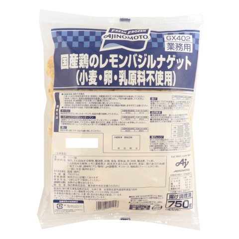 | 原材料 | 鶏肉(国産)、たん白加水分解物、醸造酢、砂糖、食塩、風味油、衣(米粉、醸造酢、でん粉、たん白加水分解物、レモン濃縮果汁、粉末状大豆たん白、香辛料、食塩)、揚げ油(なたね油)/加工でん粉、調味料(アミノ酸等)、pH調整剤、キシロース、増粘剤(グァー)、ビタミンB1、(一部に大豆・鶏肉を含む) |