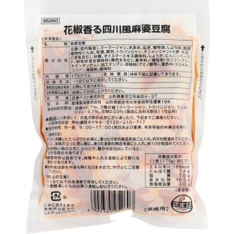 | 原材料 | 豆腐(国内製造)、マーラージャン、水あめ、ねぎ、植物油、しょうゆ、粒状植物性たん白、老酒、豚肉、トウバンジャン、テンメンジャン(小麦・大豆・ごまを含む)、砂糖、オイスターエキス調味料、しょうが、にんにくペースト、粉末状混合調味料(鶏肉含む)、香辛料/増粘剤(加工テンプン、キサンタンガム)、加工デンプン、調味料(アミノ酸等)、着色料(カラメル、ココア)、凝固剤、酸味料 |