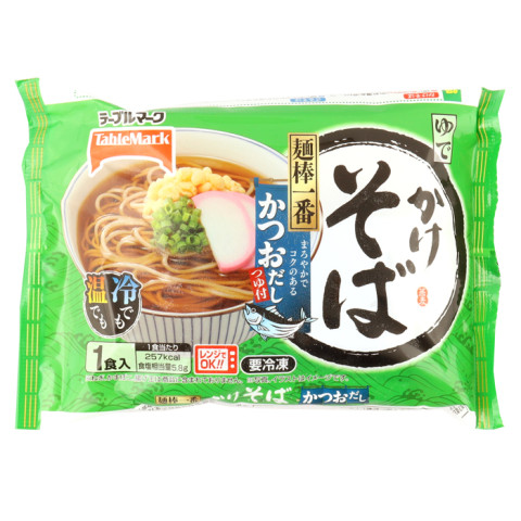 | 原材料 | めん[小麦粉(国内製造)、そば粉、小麦たん白、卵白粉/加工デンプン]、つゆ[果糖ぶどう糖液糖、しょうゆ、食塩、たん白加水分解物、みりん、かつおエキス、かつお節、しいたけエキス、酵母エキス、こんぶエキス、砂糖、宗田かつお節、さば節、魚介エキス/調味料(アミノ酸等)、カラメル色素、香料、酸味料、スモークフレーバー]、(一部に小麦・そば・卵・さば・大豆を含む) |