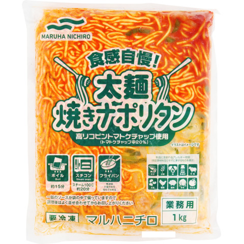 | 調理方法(2) | <フライパン(鉄板)の場合> 十分にあたためたフライパンに油をうすくひき、解凍した商品を入れ、少量の水を加えて蒸しながら炒めてください。 ※めんがほぐれにくい場合、水を多めに加えてください。 ※解凍が不十分なまま炒めますと、めんが切れやすくなります。 ※必要以上の加熱は調理不良の原因になりますのでご注意ください。 ※一部のソースが袋の中で偏っていますので、調理後はよく混ぜ合わせてからお召し上がりください。 |