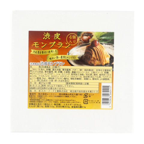| 原材料 | あん(生あん、砂糖、還元水飴、栗甘露煮、バター、卵)(国内製造)、乳等を主要原料とする食品、栗甘露煮、卵、砂糖、小麦粉、濃縮マロンペースト、上掛けソース、粉糖、バニラクリームパウダー、ショートニング、食用加工油脂/乳化剤、香料、着色料(カラメル、フラボノイド、カロテン、クチナシ)、ソルビトール、安定剤(加工でん粉、ペクチン)、リン酸塩(Na)、増粘剤(アルギン酸Na、増粘多糖類)、硫酸Ca、酸味料、pH調整剤、(一部に乳成分・小麦・卵・大豆を含む) |