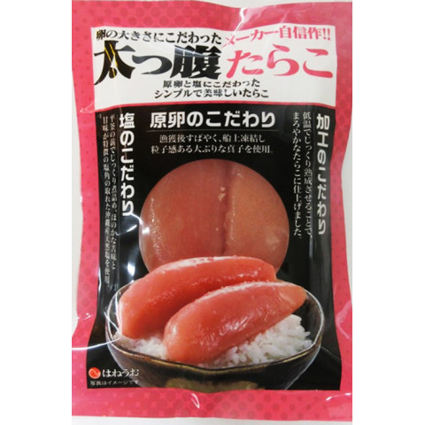 | 原材料 | すけとうだらの卵巣(ロシア又はアメリカ)、食塩/調味料(アミノ酸等)、ソルビット、酸化防止剤(V.C)、酵素、発色剤(亜硝酸Na) |