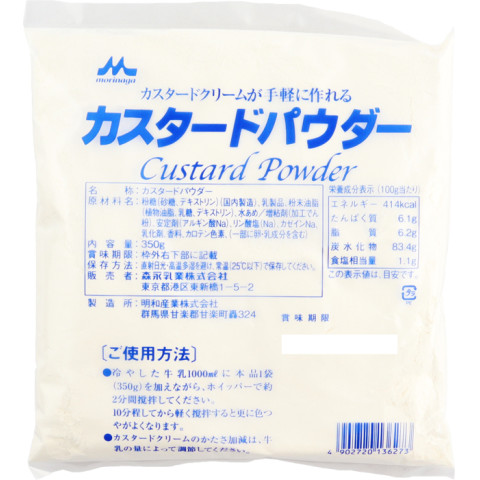 | ご使用方法 | ●冷やした牛乳1000mlに本品1袋(350g)を加えながら、ホイッパーで約2分間攪拌してください。10分程してから軽く攪拌すると更に色つやがよくなります。 ●カスタードクリームのかたさ加減は、牛乳の量によって調整してください。 |