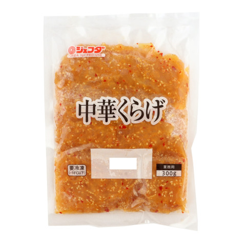 | 原材料 | 塩蔵くらげ(くらげ(タイ)、食塩)、砂糖、ごま、醸造酢、食塩、ごま油、唐辛子、たん白加水分解物(豚肉を含む)/調味料(アミノ酸等)、増粘剤(加工でん粉、キサンタン)、ソルビトール、カロチノイド色素、漂白剤(次亜硫酸Na)、ミョウバン(一部にごま・豚肉を含む) |
