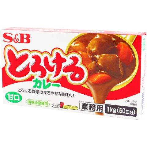 | おいしい作り方 | 1.厚手の鍋に油を熱し、適当な大きさに切った肉、野菜をよく炒めます。 2.炒め終わりましたら、水またはスープを加えて材料がやわらかくなるまで煮込みます。 3.いったん火を止めてから<とろけるカレー甘口 1kg>を刻んで入れ、よく溶かし再び弱火で煮込んでください。おいしいカレーができ上がります。 |