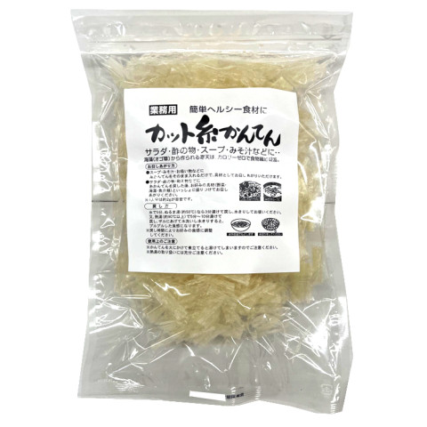 | ご使用方法 | 戻し方 水で5分、ぬるま湯(約50℃)なら3分浸けて戻し、水切りしてお使いください。 また、熱湯(約90℃以上)で5〜10分浸けて戻し、ザルにあげて水洗いし水切りすると、プルプルした食感になります。 ※戻し時間によりお好みの食感に調整してください。 使用上のご注意 寒天を火にかけて煮立てると溶けてしまいますのでご注意ください。 |