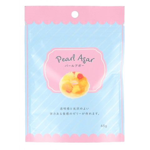 | 調理方法 | フルーツゼリー(3〜4人分) 材料:パールアガー15g(大さじ2)、砂糖60g、水350ml、フルーツ缶詰1缶(内容総量420〜500g) 1.缶詰のフルーツとシロップを分けて別々の容器に入れておく、フルーツは好みの大きさにカットしておきます。 2.パールアガーと砂糖を水気をよくふき取ったボールで混ぜ合わせます。 3.水を沸騰させ、2を少しずつ入れスプーン等でよく溶かし、火を止めます。 4.3の中に1で分けておいたシロップ150mlをいれ、よく混ぜてフルーツの入った容器に流し固めます。 |