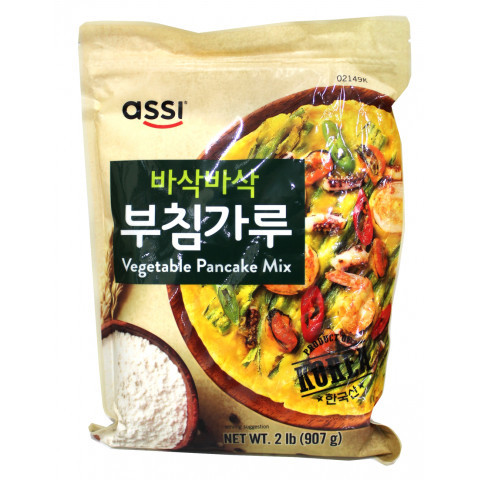 | 美味しい作り方(2人分) | (1)チヂミ粉120gに水200mlを入れ、ダマにならないようによく混ぜます。 (2)ニラ、玉ねぎ、海老など、お好みの具材を適当な大きさに切り、(1)に入れて混ぜ合わせます。 (3)熱したフライパンに油をひき、(2)を流し込み形を整え、弱火〜中火で焦がさないよう両面を2〜3分ほどでこんがりと焼き上げます。 |