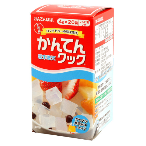 | 基本の使い方 | 1.水約500mlにかんてんクック1袋(4g)を入れて火にかけ、かき混ぜながら煮溶かします。 ※(3)で牛乳・果汁を加える場合は水の量を調節してください。(中の料理集参照) 2.沸騰したら、ふきこぼれない程度の火にして1〜2分間沸騰を続けます。 3.火を止め、砂糖・牛乳・果汁などでお好みの味付けをします。 4.型に流し、フルーツなどを入れ固めます。常温で固まりますが、冷蔵庫で冷やすといっそうおいしく召し上がれます。 ※果汁など酸味のあるものは、火を止めてから加えてください。一緒に煮たてると固まらなくなることがあります。 |