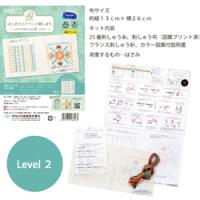 詳しいイラスト付き説明書と共に、図案プリント済布、糸、針がセットされています。