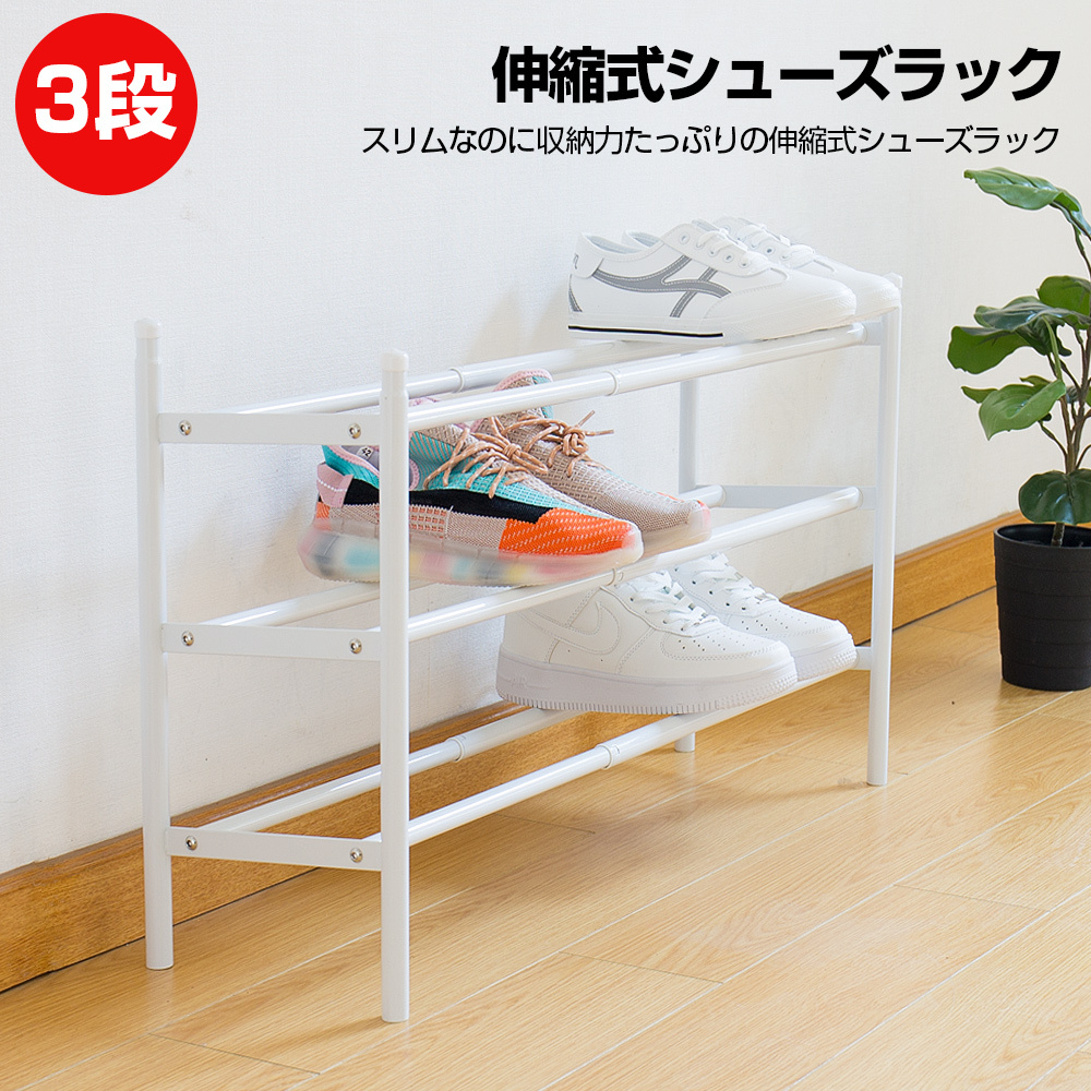 シューズラック 伸縮 省スペース 3段 靴棚 下駄箱 組み立て式 オープンラック 収納ラック ホワイト