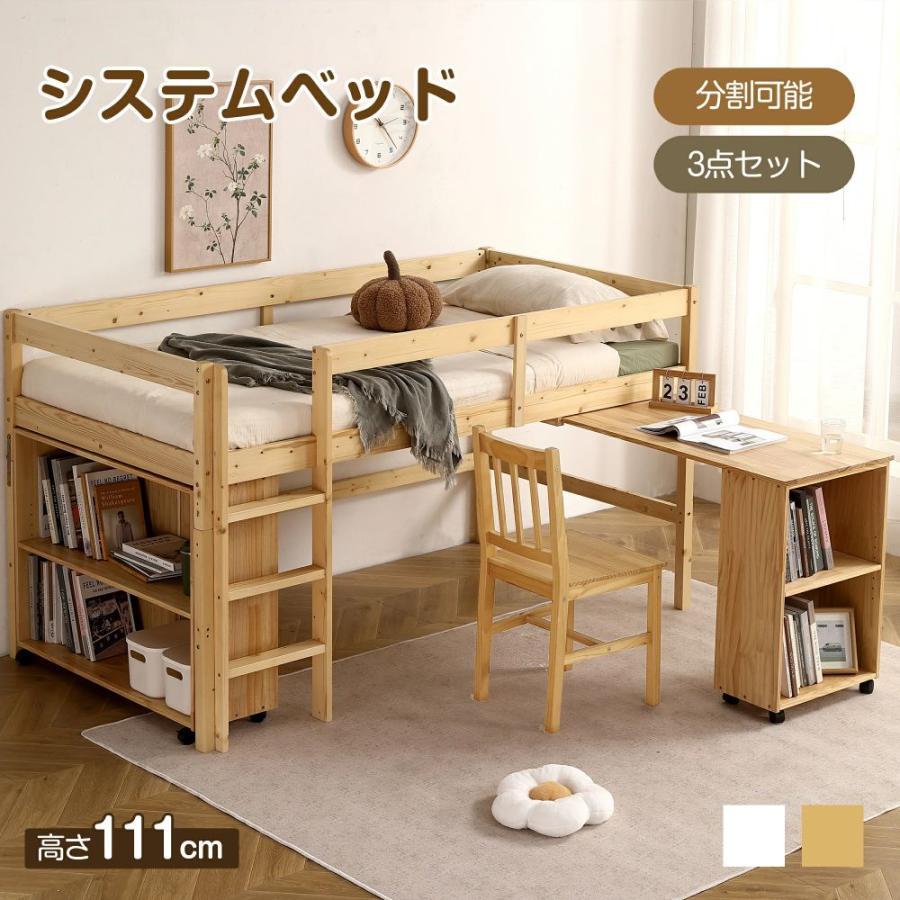 システムベッド システムベッドデスク 分割可能 ロフトシステムベッド すのこ シングル デスクベッド ロフトベッド システムデスクロータイプ 学習机 本棚 ブックシェルフ セット 木製ベッド 天然木 子供用ベッド 収納棚 北欧風 子供 ホワイト ナチュラル 2025新生活