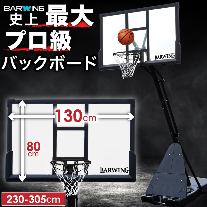 ★3年保証★ バスケットゴール プロ級バックボード 130×80cm 無段階調節 230cm〜305cm キャスター付き 屋外 家庭用 練習用 公式サイズ ミニバス
