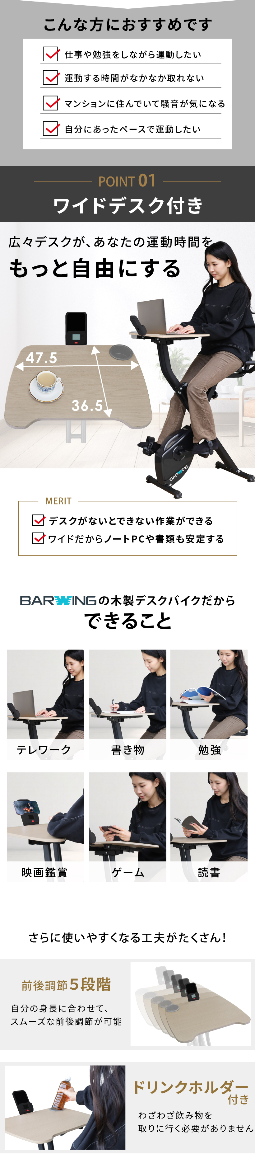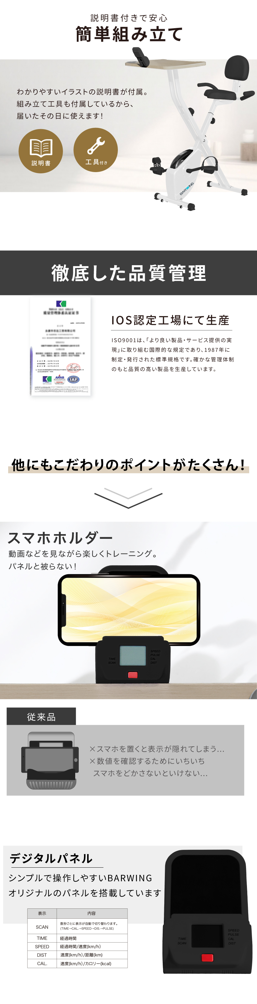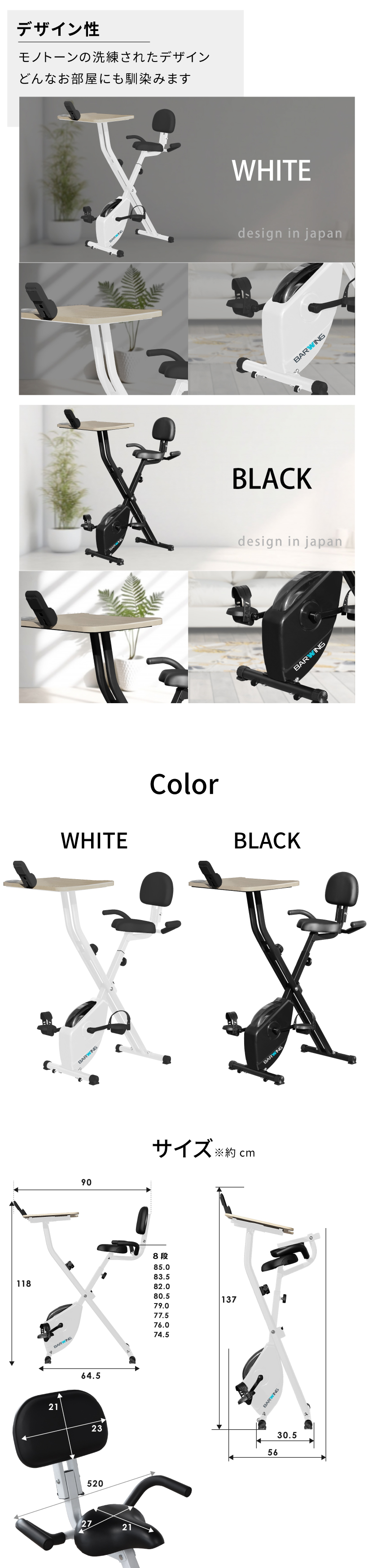 | 基本スペック | ・ワイドデスク付き ・負荷調節16段階 ・マグネット負荷式 ・静音 ・ストラップ付きペダル |