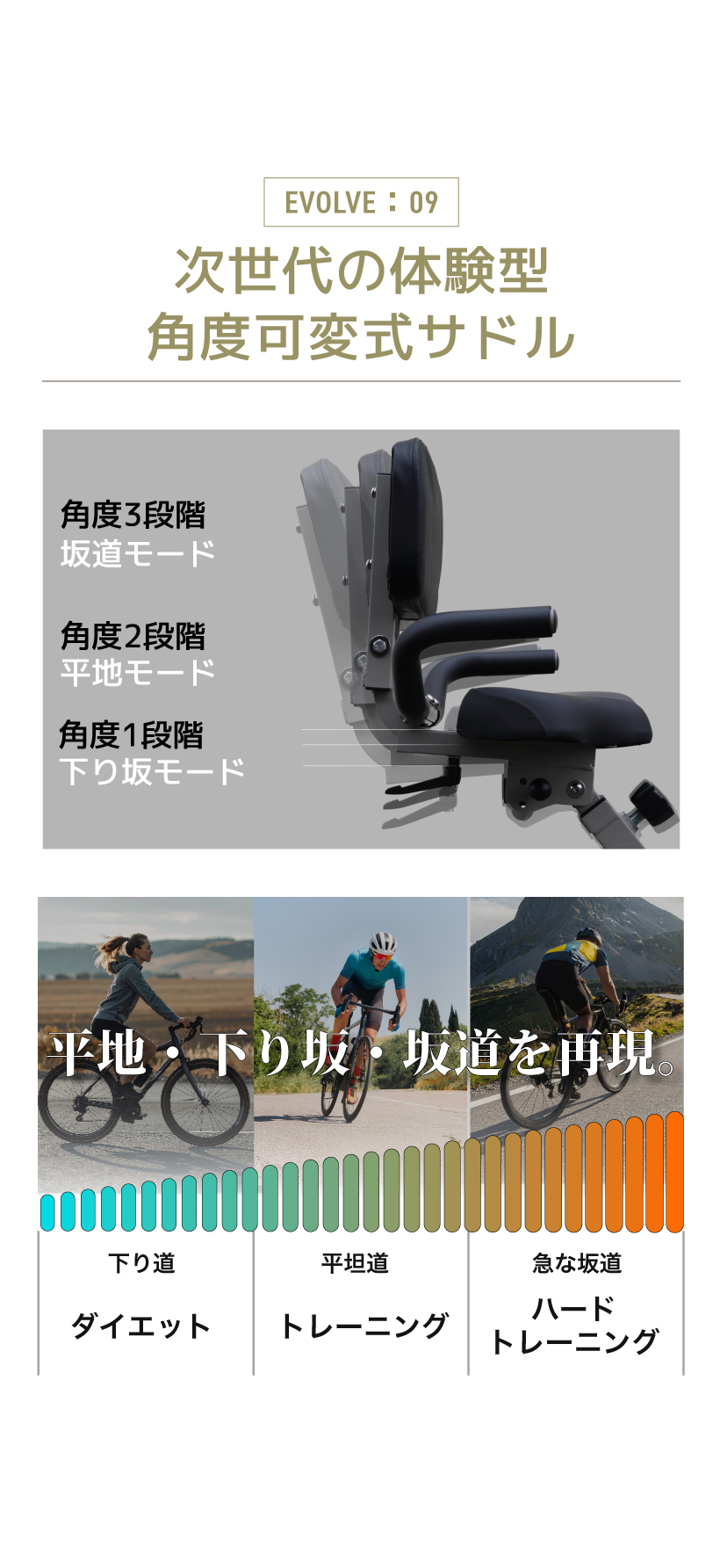 | 特徴 | ・高さ調節:8段階 ・角度調整:3段階 ・負荷調節16段階 ・連続使用時間:200分 |
