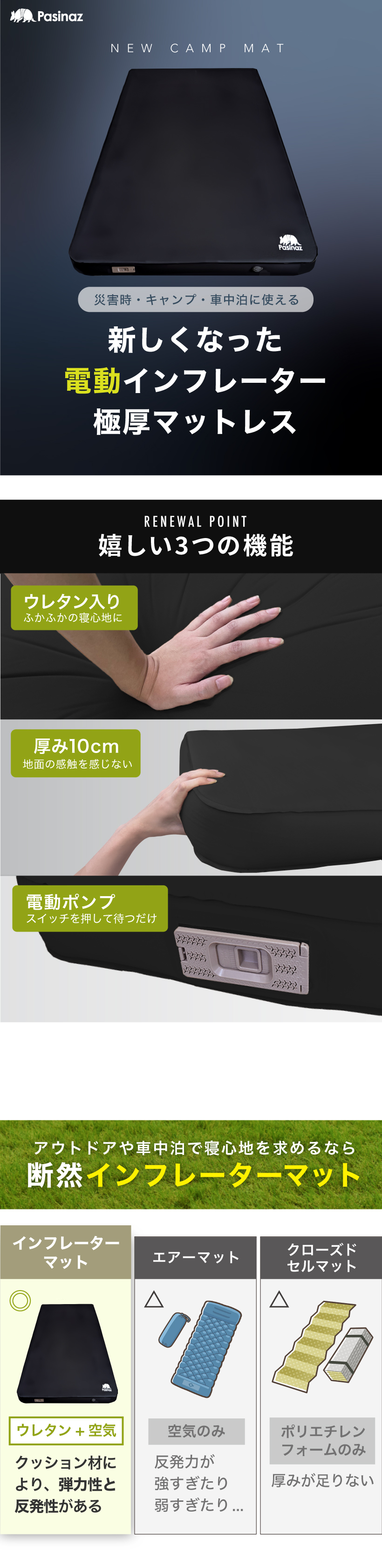 ★期間限定価格 1/6まで★ 電動ポンプ内蔵 インフレーターマット ダブル 電動 厚手10CM キャンプマット 自動膨張 断熱 充電式 コンパクト収納 車中泊 マット