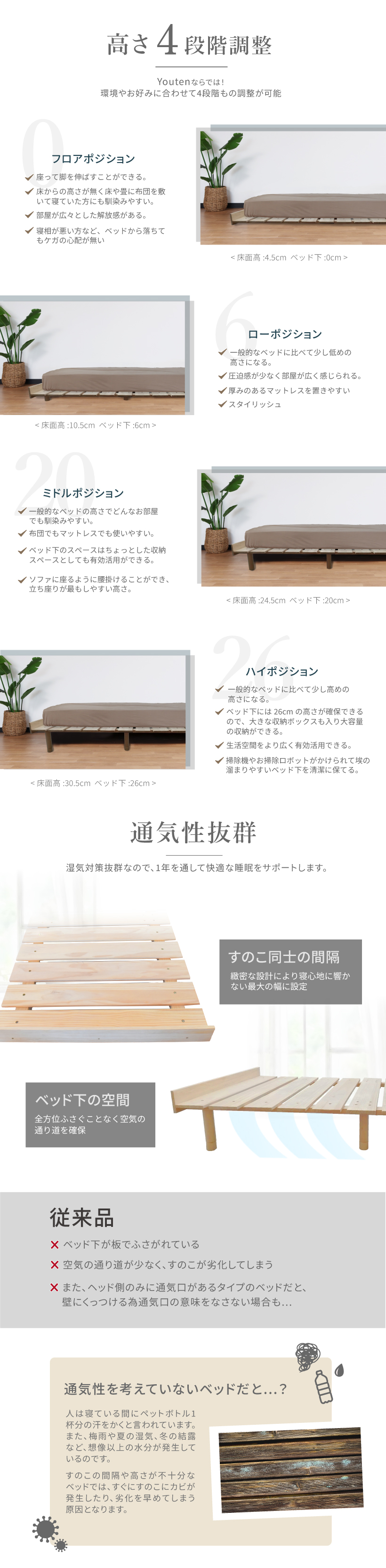 | 仕様 | ・すのこ厚み1.5cm ・高さ調整4段階可能 ・すのこ幅15cm ・耐荷重300kg ・通気性抜群 ・北欧×和 ・高耐久 ・通気性抜群 |
