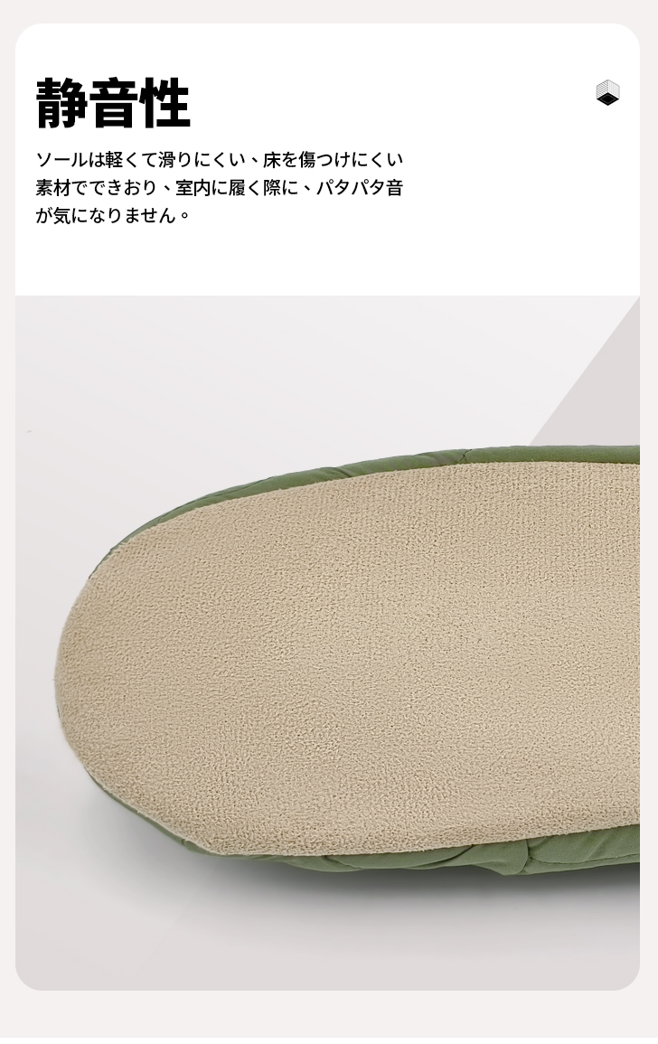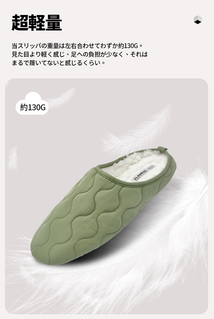 アモジのルームシューズは、冬の寒さから足を守るために設計された暖かいスリッパです。