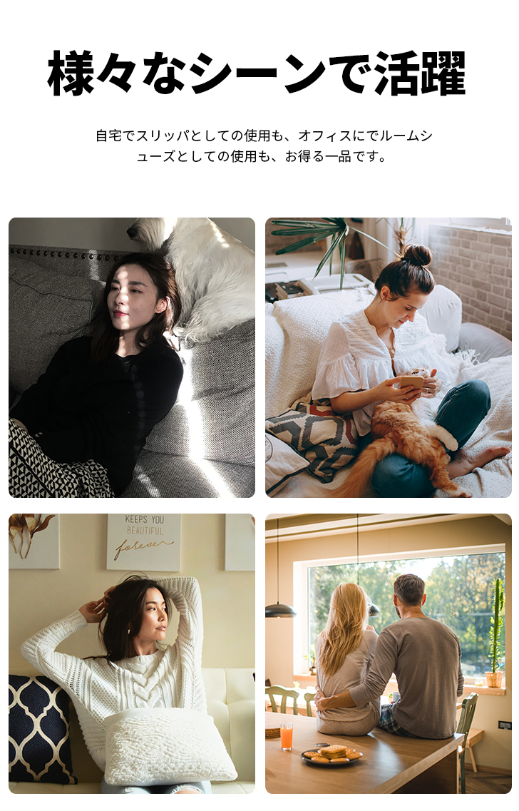 軽量で静音性に優れ、室内での移動も快適です。ふわふわのボア素材が足を包み込み、柔らかい履き心地を提供します。
