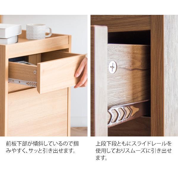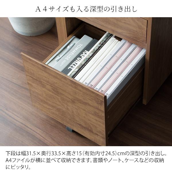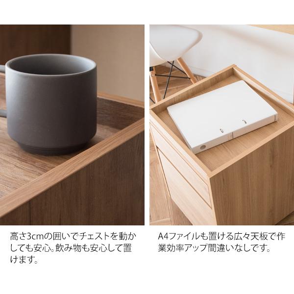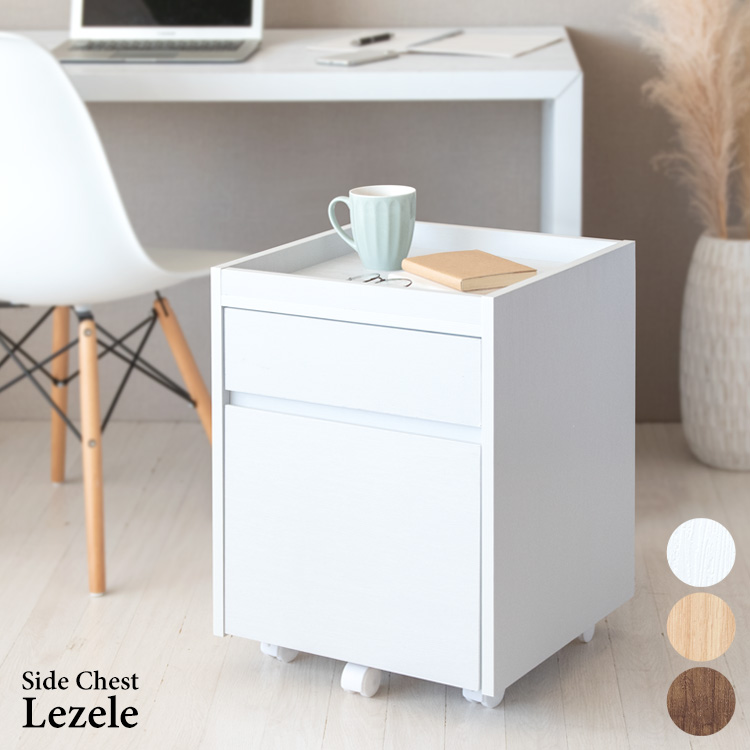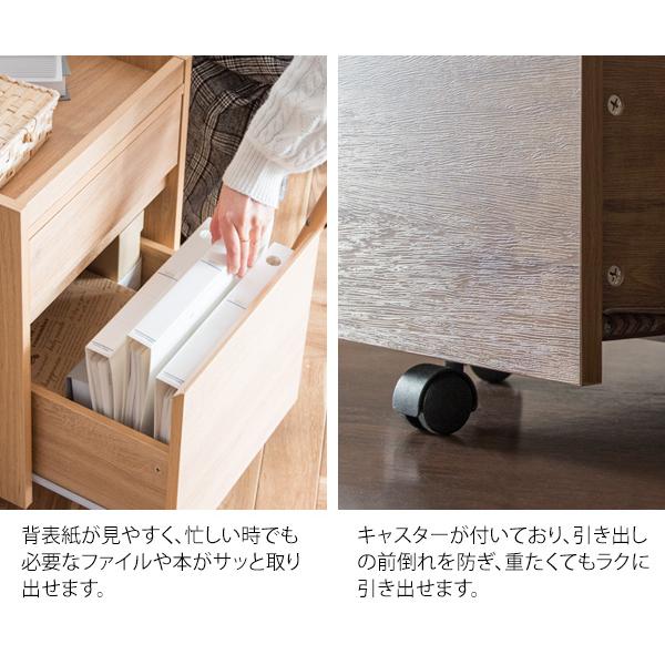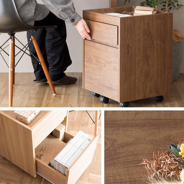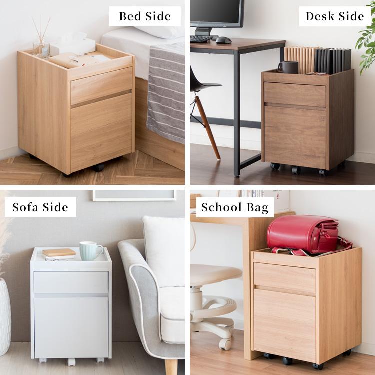 深さの異なる二つの引き出しはA4ファイルも収納できるサイズ。天板は囲いがあり書類やマグカップの落下を防げます。キャスター付きで移動もラクラク。