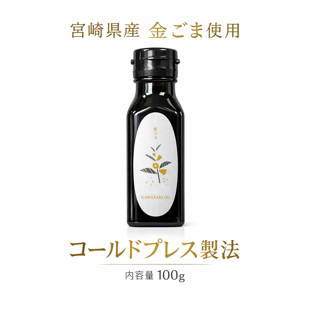 金ごま製油は、宮崎県小林市で栽培を行い、加熱・食品添加物を使用せず、コールドプレス機を使用し、生絞りを行い、活性炭フィルターを使用し自然濾過した製油です。
