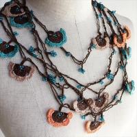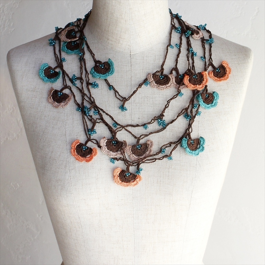 トルコの伝統的な手芸「オヤ」をモチーフにして、手編みで作られたネックレスです。このピースは、かぎ針で編んだ「トゥ・オヤ」の大ぶりな平面モチーフが使われた華やかなデザイン。