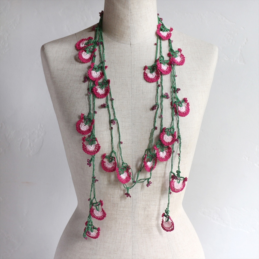 トルコの伝統的な手芸「オヤ」をモチーフにして、手編みで作られたネックレスです。このピースは、かぎ針で編んだ「トゥ・オヤ」。様々な色の取り合わせが、首もとを華やかに彩ります。 【トゥ・オヤ】トルコ地中海沿岸地方独特の伝統手工芸で、女性たちが頭にかぶるスカーフの縁飾りとして発展してきました。スカーフを飾るモチーフは、花や野菜などで平面なものから立体的に模られたものまで様々で、女性たちがオリジナルのアイデアで工夫を凝らして、作ってきたものです。近年、スカーフ飾りだけではなく、手工芸の文化としての注目が集まり、オヤをモチーフにした新しい作品が生まれています。(かぎ針で編むトゥ・オヤのほか、刺繍針のイーネオヤ、ビーズが入ったボンジュック・オヤがあり、それぞれ区別されています)