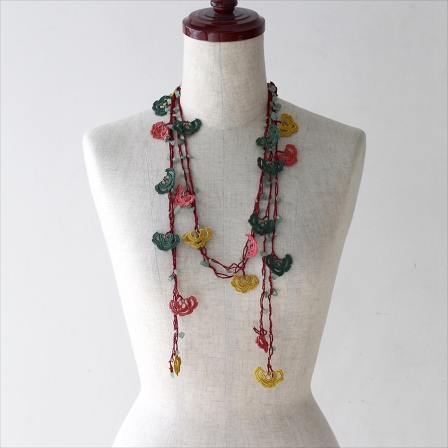 トルコの伝統的な手芸「オヤ」をモチーフにして、手編みで作られたネックレスです。このピースは、かぎ針で編んだ「トゥ・オヤ」。様々な色の取り合わせが、首もとを華やかに彩ります。