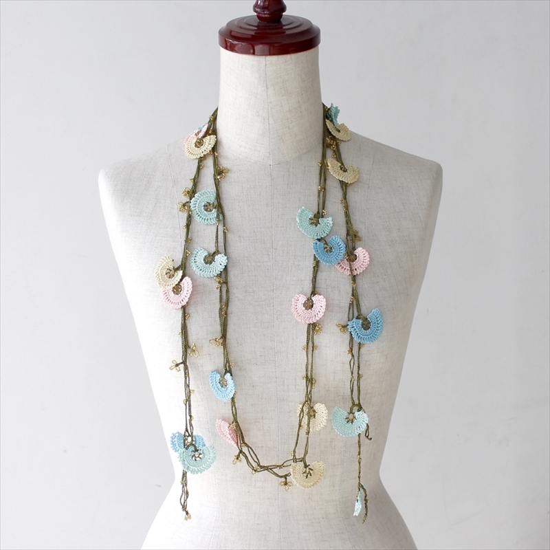 トルコの伝統的な手芸「オヤ」をモチーフにして、手編みで作られたネックレスです。このピースは、かぎ針で編んだ「トゥ・オヤ」。様々な色の取り合わせが、首もとを華やかに彩ります。