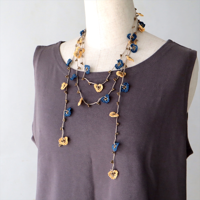 レース編みの花をつなげたラリエット。首元に巻き付けるほか、ベルトのようにつけたり、お部屋のアクセントに飾ったりと、アレンジしてお使いいただけます。トルコでは、女性たちのスカーフの縁飾りとして作られています。 サイズ表記の長さは一本にのばした時の長さです。